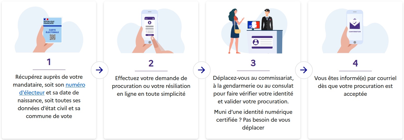 Pour faire votre pré-demande de procuration, rdv sur le site maprocuration.gouv.fr. Une validation de votre identité est ensuite nécessaire, en commissariat, gendarmerie ou consulat, ou en ligne si vous disposez d’une identité numérique certifiée.